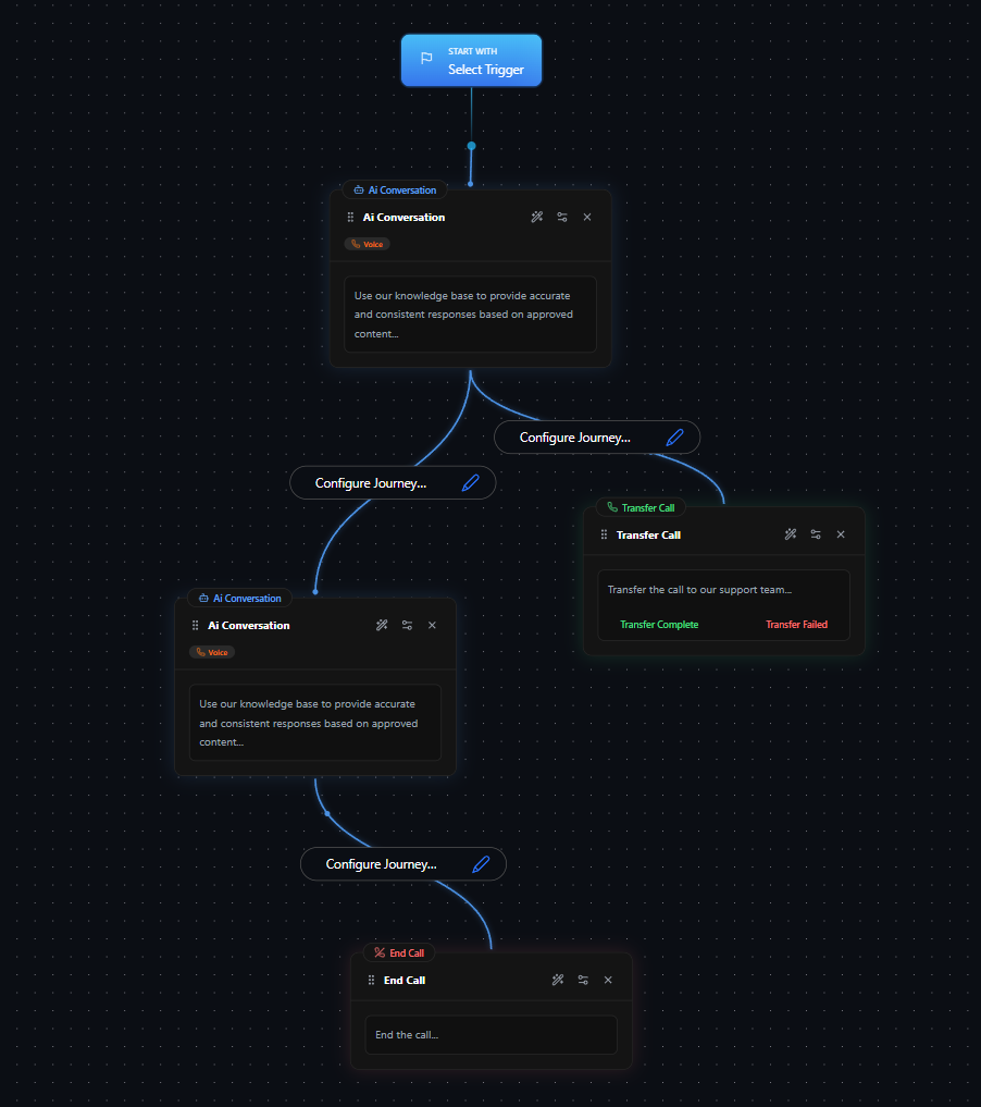 To build an interactive conversation workflow, nodes must be connected through Decision Triggers. These triggers act as logical gates, determining when and how the AI transitions from one node to another.- Nodes must be linked through Decision Triggers, which determine when and how the workflow progresses.