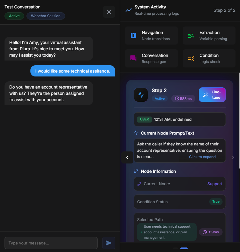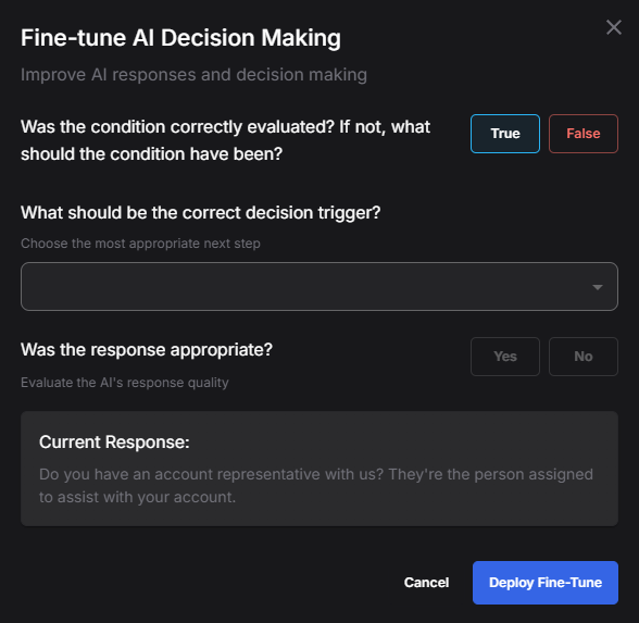 One of the most powerful features of the Test Bench is Fine-Tuning, which allows users to correct AI decision-making errors and refine behavior. If the AI makes an incorrect decision, it can be adjusted and retrained based on real interactions.- Condition evaluation – If the AI incorrectly determines that a condition is met or unmet.